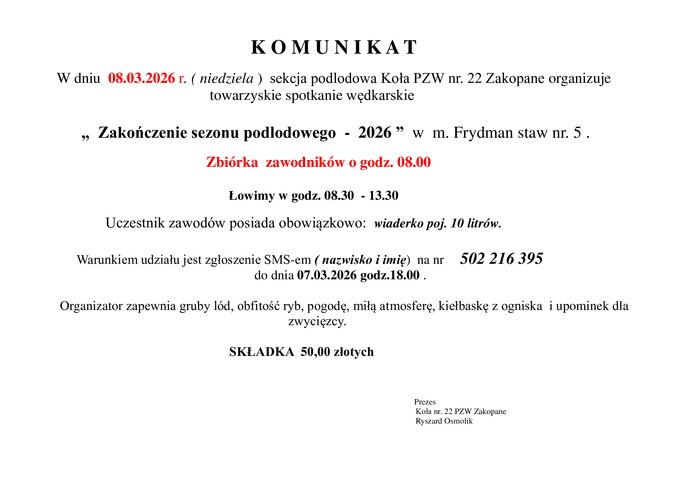 W celu opłacenia skladek członkowskich i zezwoleń rocznych na połów w wodach okręgu PZW Nowy Sącz prosimy o kontakt z nowym skarbnikiem koła Jakubem Janikiem, tel. 602 279 950. Skarbnik przyjmuje na terenie Camper Parku Olimp ul.Józefa Piłsudskiego 28B, Zakopane.